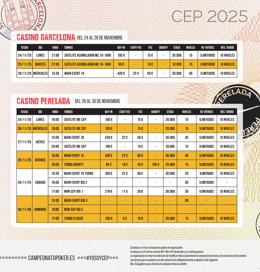 El programa de la última etapa esta formado por cuatro eventos y satélites presenciales en Casino Barcelona y Casino Perelada. El Evento Principal (500 €) arrancará el miércoles 26 de noviembre con su Día 1A en Casino Barcelona. Los Días 1B, 1C y 1D Turbo, además del Día 2 y Día 3, se celebrarán en Casino Perelada del 27 al 30 de noviembre.