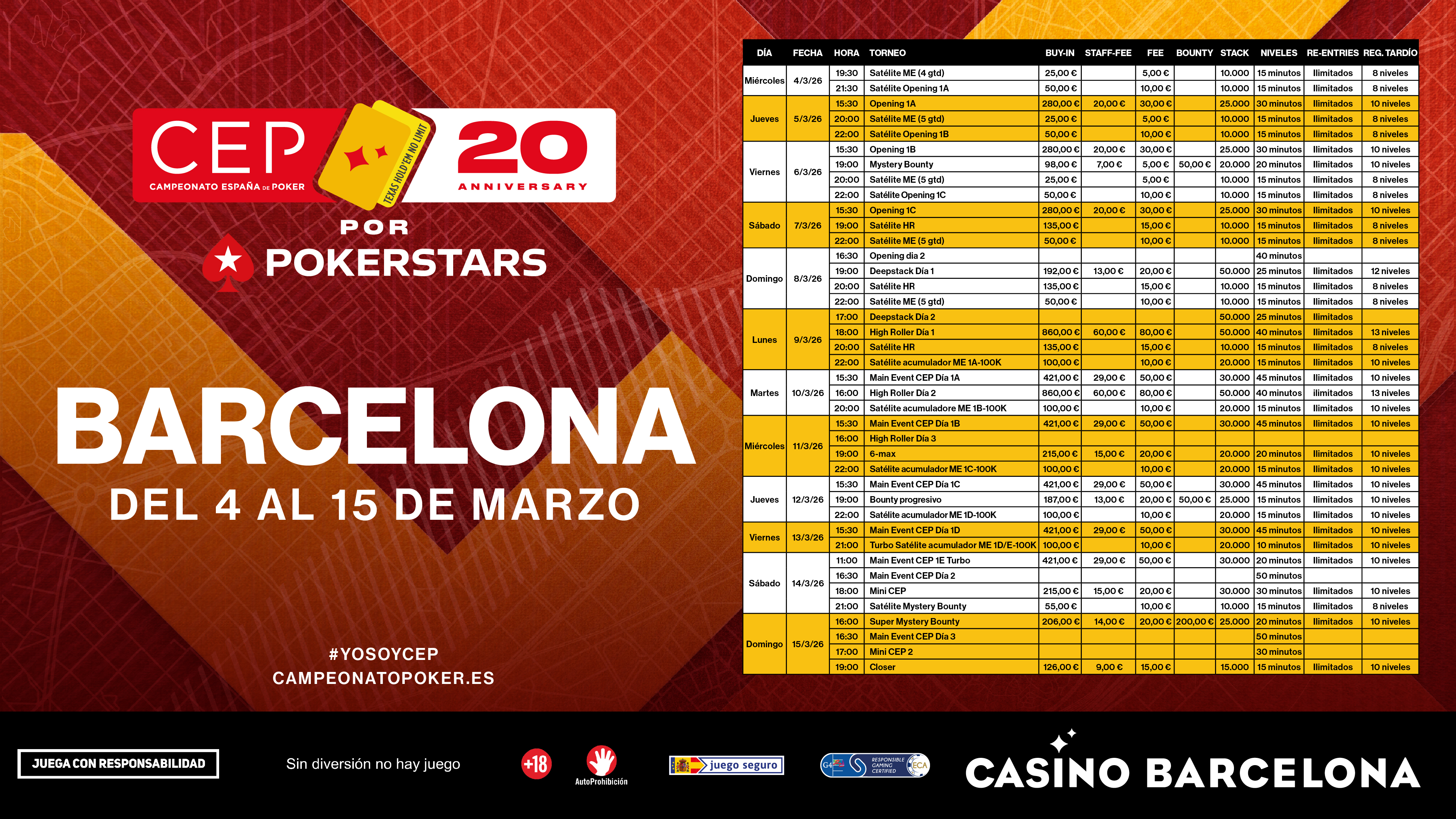 Durante los próximos días, los jugadores competirán en un programa completo que incluye el tradicional Main Event (500€), el Mini CEP (250€), High Roller (1.000€) y Opening (330€), además de distintos torneos paralelos.